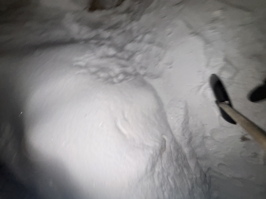 The image captures a dimly lit, enclosed snowy environment, consistent with a snow tunnel or excavated cave, located within the city of Ферма, Russia. Irregularly textured white snow and ice formations comprise the ceiling and walls, with visible light reflections indicating a direct illumination source. In the lower center-right, a shovel with a dark, broad blade and a light-colored wooden handle is angled towards the ground, suggesting active or recent excavation of snow. A dark, indistinct object, potentially a gloved hand or boot, is partially visible in the bottom right corner, indicating the presence of an individual operating the shovel or recording the scene. No other individuals are visible.