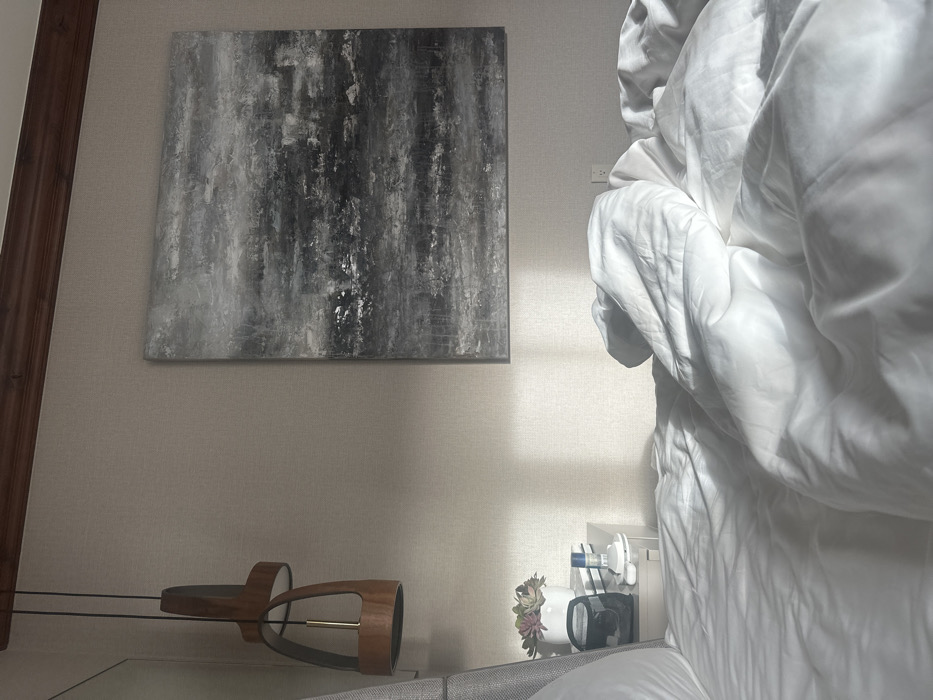 This image captures an interior bedroom or hotel room, with no individuals present. While the specific address in Vail, United States, cannot be determined from the interior alone, the room presents modern residential or hospitality decor. The foreground and midground feature a bed with rumpled white sheets and a duvet, indicating recent use. To the left of the bed, a light-colored nightstand supports a small succulent plant, a white cylindrical object, a clear plastic case containing dark items, a white wireless charger with an illuminated blue light, and a clear bottle. Above the nightstand, two wooden, nested pendant lamps with brass accents hang from the ceiling. A large, rectangular abstract painting, characterized by textured grey, black, and white horizontal strokes, is mounted on the light beige, textured wall. A dark wooden trim runs along the top perimeter of the wall. Natural light from an unseen source casts distinct shadows onto the wall, notably behind the nightstand. A white electrical outlet is visible on the lower right portion of the wall.