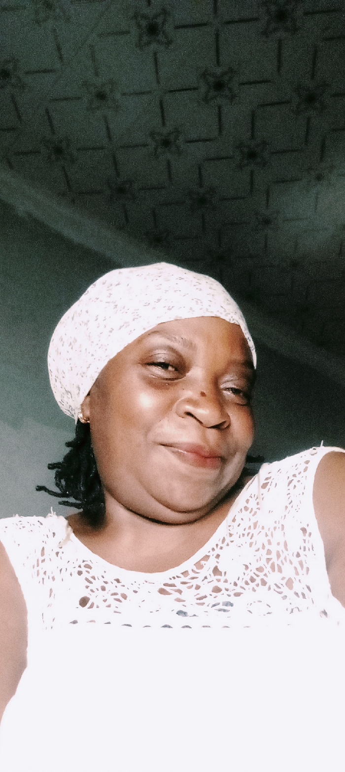 A dark-skinned woman with a warm smile wears a white crocheted top and a matching head covering