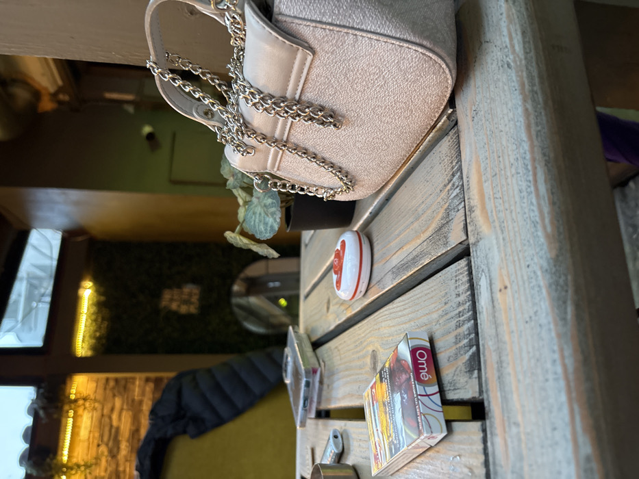The image depicts a close-up, low-angle view of a light-colored wooden slatted table, indicative of a cafe or restaurant setting in Svishtov, Bulgaria. On the right side of the table, a light-beige, textured handbag with a silver-toned chain strap is prominently displayed. To the left of the handbag, a small black pot containing a green-leafed plant is visible. Further left on the table, a white circular service button with a red central design is positioned. Adjacent to it, a smartphone enclosed in a transparent case with a silver metallic ring holder is present. On the far left, an unopened pack of "OME" brand cigarettes, featuring a white box with colorful stripes and a visible health warning label, rests on the table. A silver-colored object, possibly a lighter or a small ashtray, is partially visible near the cigarette pack. The background features a dark green wall adorned with artificial foliage, displaying blurred white text that appears to read "THE [unclear word] PLACE," and a small arched mirror below it. To the left, a light brown, textured wall is visible, with a dark jacket draped over a chair or bench. Yellow strip lighting illuminates the upper background. The lighting conditions suggest an evening or indoor environment.