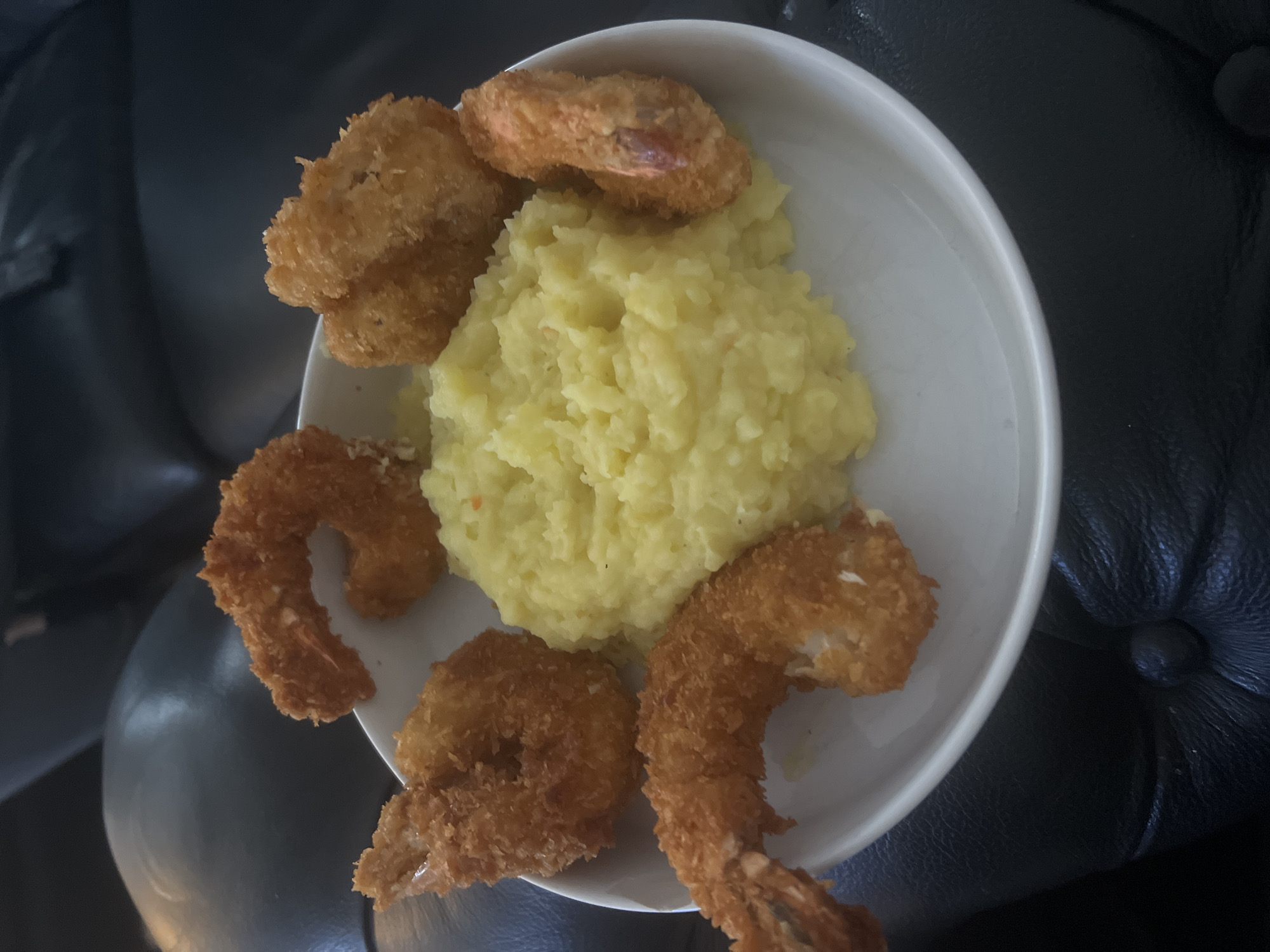 - "A white bowl is filled with mashed potatoes and fried shrimp" by FM-g4ocG3, licensed under CC BY 4.0