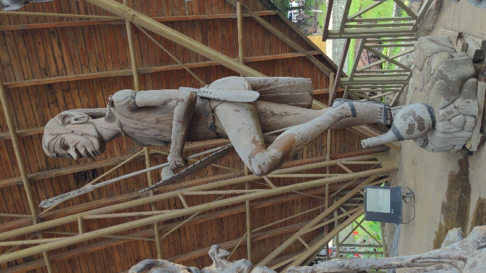 The image displays a weathered, light-colored sculpture of an African male figure, positioned within the Arusha Declaration Monument complex in Arusha, Tanzania. The figure is depicted in a dynamic stance, with its left leg raised and foot resting on a gourd-like object, which is part of the sculpted rock-like base. The statue holds a long, thin, pole-like implement (resembling a spear or staff) across its body with both hands. It wears a short tunic or vest, a loincloth, and features an elongated ear with an ornament. The statue exhibits signs of weathering and discoloration, particularly on the legs and lower body. The scene is set under an expansive wooden pavilion, characterized by a slatted roof and a complex framework of light-colored wooden beams and supports. To the left, a portion of another similar statue is visible, and on the sandy/dirt ground, a black floodlight rests. A wooden railing separates the pavilion from an outdoor area featuring green grass, foliage, and distant vehicles and structures, indicative of an urban environment.