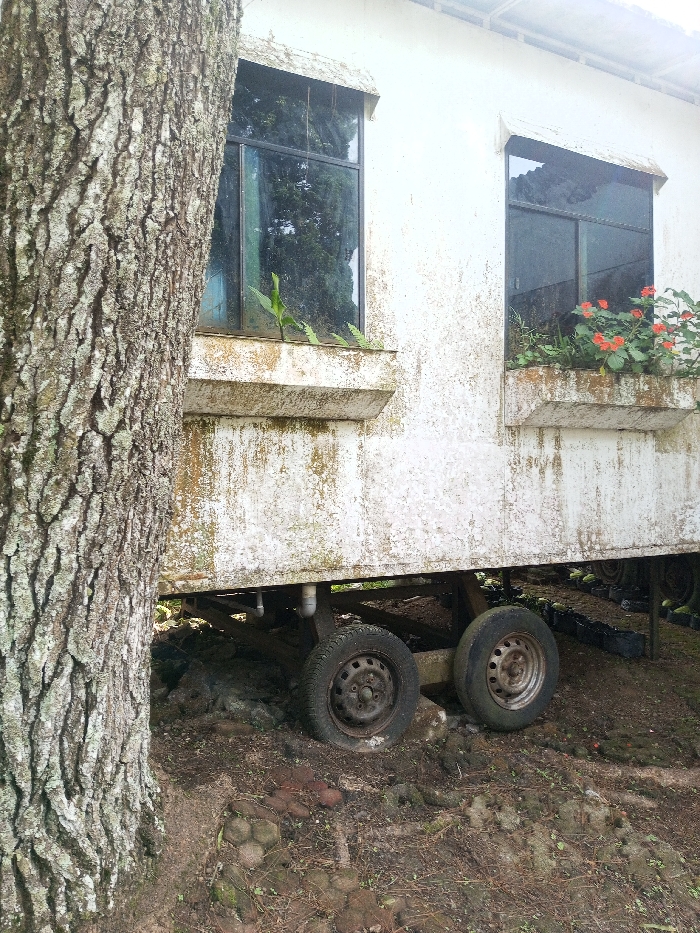 An old, white mobile home sits near a tree. The structure has two windows, each with a built-in flower box below. Plants grow in the boxes, with red flowers visible in one. The home is mounted on a trailer with black wheels. The paint is peeling and the siding shows signs of aging. The ground is covered in dirt, leaves, and some mossy stone. The tree trunk is thick and textured.