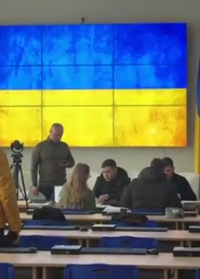 classroom setting with several people gathered around tables. Behind them is a large screen displaying the Ukrainian flag. A man in a dark green shirt stands and looks at his phone. He is likely addressing the group. People are seated at the tables, some looking at papers or laptops. The room has blue chairs and desks with keyboards and other equipment on them. The overall atmosphere appears to be focused and possibly official.