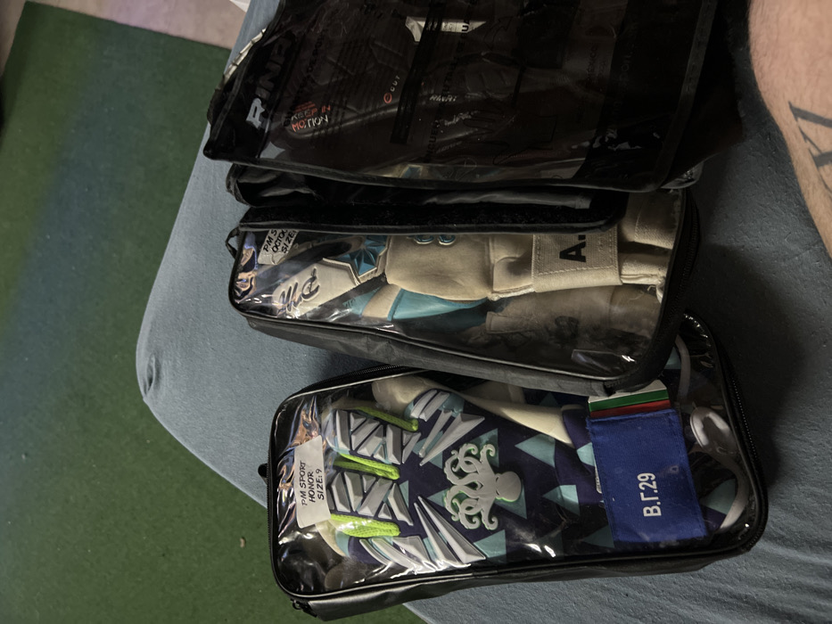 - "The scene displays three transparent zippered cases containing goalkeeper gloves, positioned on a light blue upholstered surface with a green surface visible in the background" by FM-CCVbs1, licensed under CC BY 4.0