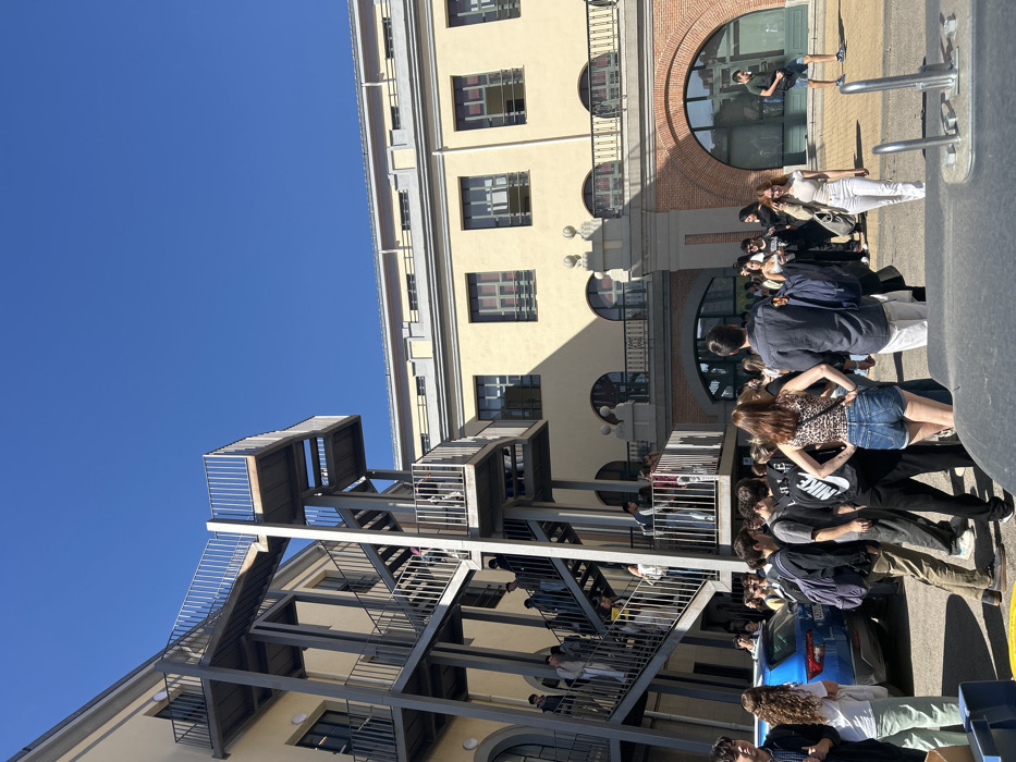 The image depicts an outdoor scene at the Faculty of Information Sciences, Universidad Complutense de Madrid, Spain, under a clear blue sky with strong sunlight casting distinct shadows. Approximately 50-70 young individuals, appearing to be students, are gathered in a paved area outside two multi-story buildings. The building on the left features a light yellow stucco facade with dark-framed windows and a prominent external, multi-level metal staircase with grey railings zigzagging up its side. Multiple individuals are visible ascending and descending this staircase. The building on the right, also with a light yellow facade and dark-framed windows, exhibits a lower level characterized by brick archways and a balcony with stone balusters. In the foreground and mid-ground, clusters of young people stand, converse, and walk. Clothing observed includes t-shirts, hoodies, jeans, shorts, and various casual tops; many individuals carry backpacks. A dark blue hatchback car is parked in the mid-ground, left of center. A dark grey rectangular object partially obscures the immediate foreground. Shadows from the buildings and people are prominent, indicating bright overhead sunlight.