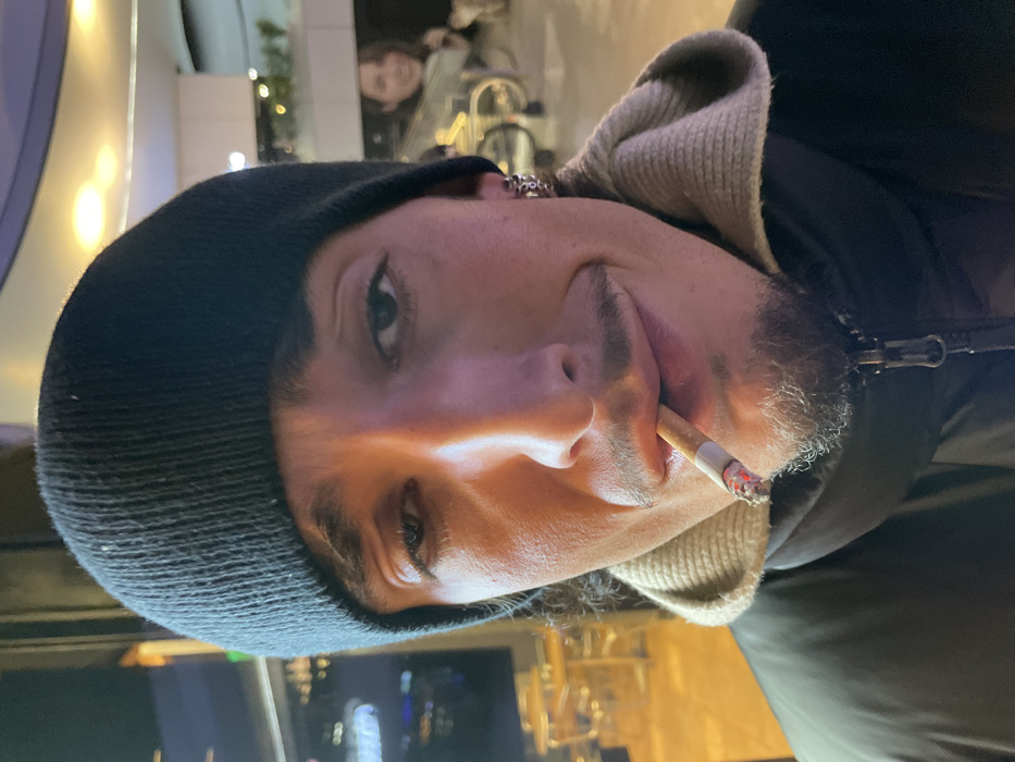 A close-up image depicts a male individual with a cigarette in his mouth, observed in what appears to be an indoor or semi-outdoor public setting at night, likely in the city of Plaisir, France. **People:** * **Primary Subject:** A male, mid-20s to mid-30s, with olive skin tone, dark hair, and a visible five o'clock shadow around his chin and upper lip, forming a small goatee and thin mustache. He wears a dark, possibly black, knit beanie covering his forehead and ears. His left ear features a silver-colored hoop earring with a decorative, possibly skull-like, element. He is dressed in a dark, possibly black, zipped jacket or coat with a high, ribbed, light-colored collar, possibly beige or light grey, visible beneath the jacket's outer layer. He has a lit cigarette, with a visible glowing ember, held between his lips. His eyes are directed towards the camera, and his mouth exhibits a slight smirk or smile. * **Secondary Subject (Background):** A blurry, out-of-focus individual, likely female, with dark hair, is visible in the background to the right of the primary subject. She appears to be smiling and is positioned behind a reflective surface or window. **Objects:** * **Cigarette:** A lit, filtered cigarette is held between the primary subject's lips, with an orange-red glow from the burning tip. * **Earring:** A metallic, silver-toned hoop earring with a small charm is visible on the primary subject's left ear. * **Clothing:** A dark knit beanie, a dark zipped jacket, and a lighter-colored ribbed collar are worn by the primary subject. * **Background elements:** Blurry light sources, possibly from indoor lighting or reflections, are visible in the upper background. To the left, out-of-focus light-colored tables and chairs suggest a dining or waiting area. To the right, behind the primary subject, there are indistinct objects and a reflective surface, potentially a window or glass partition of an establishment. **Actions and Interactions:** The primary subject is holding a lit cigarette in his mouth and is looking directly at the camera. The interaction is primarily between the subject and the photographer. **Environment:** The scene is dimly lit, suggesting evening or nighttime. The background appears to be an interior or sheltered exterior space with artificial lighting, possibly a cafe, restaurant, or commercial area within Plaisir, France. The blurry figures and furniture indicate a public setting.
