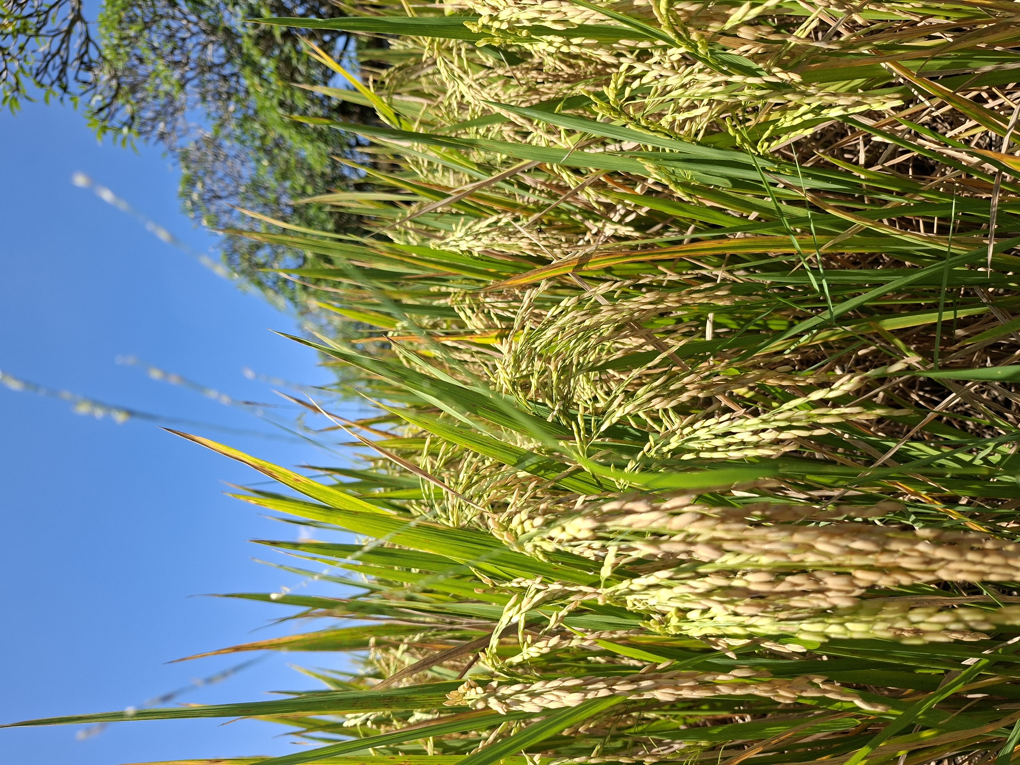 The image depicts a close-up view of a rice paddy field in Lodtunduh, Indonesia. The rice plants are predominantly green, with some leaves showing signs of maturation with a yellowish tinge. The rice grains are visible on the stalks, indicating a stage of development. Above the rice paddy, the sky is a clear blue, with some tree branches and foliage visible at the upper left. The image is taken from a low angle, looking upwards into the rice paddy and sky.