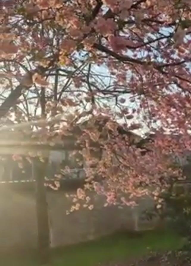 flowering cherry tree with pink blossoms in front of houses, with the sun shining through the branches