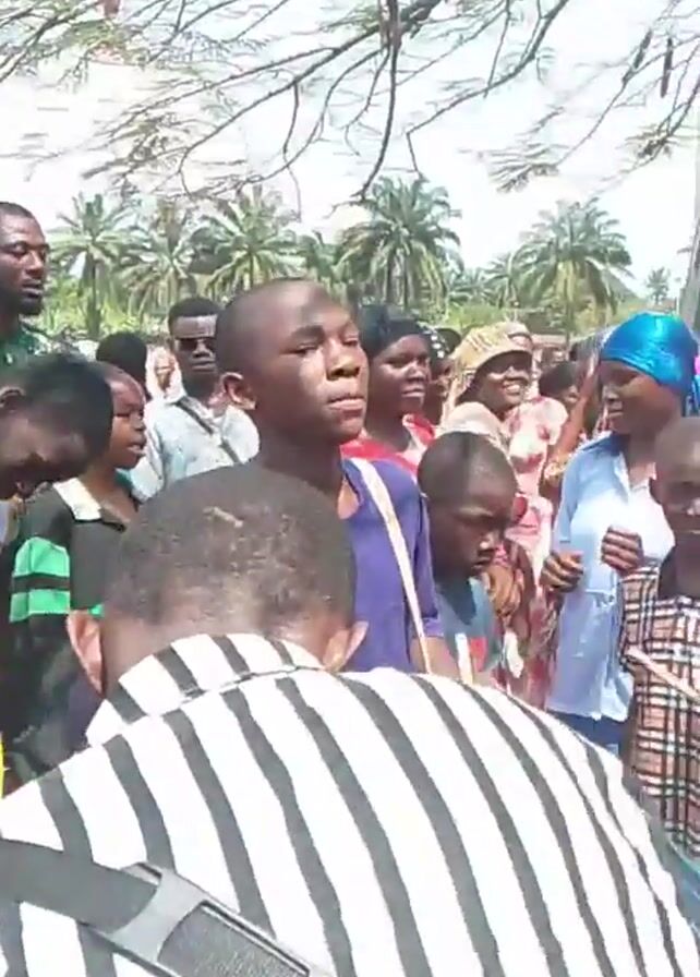 crowd of people outdoors in what appears to be a tropical environment with palm trees. Most of the people are Black. They are gathered near a white building that might be a church. The video focuses on people in the foreground, including a young man wearing a purple shirt and another individual wearing a black and white striped shirt. The sound suggests music or drumming is playing.