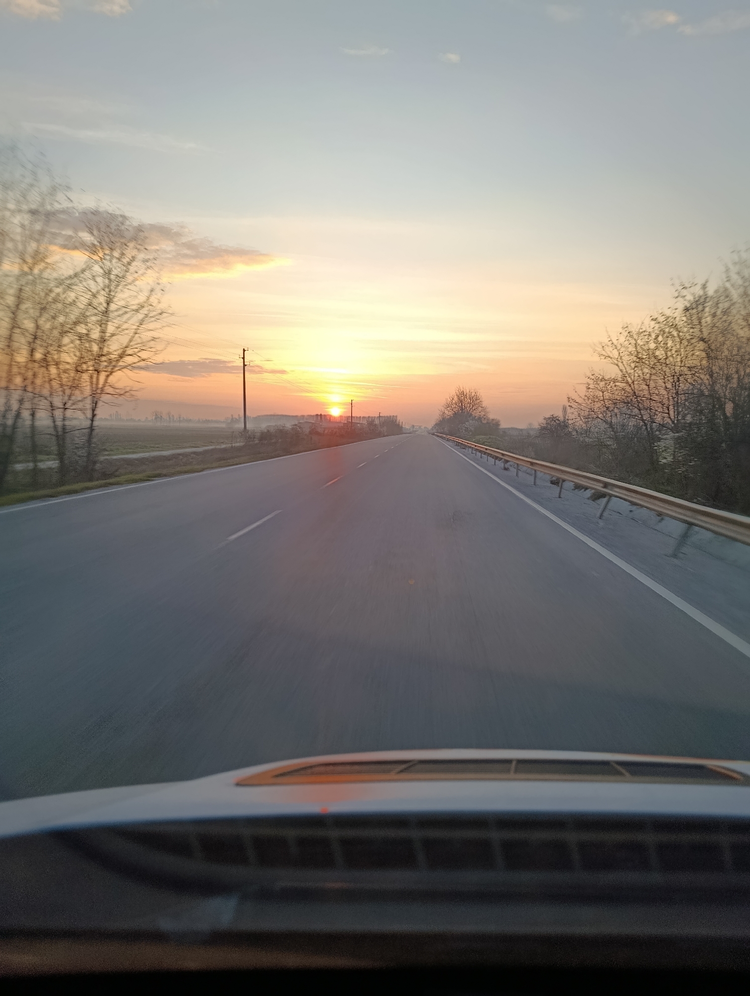 - "The image depicts a straight asphalt two-lane road observed from the interior of a vehicle, facing eastward towards the rising sun in Pazardzhik, Bulgaria" by FM-TpOq72, licensed under CC BY 4.0