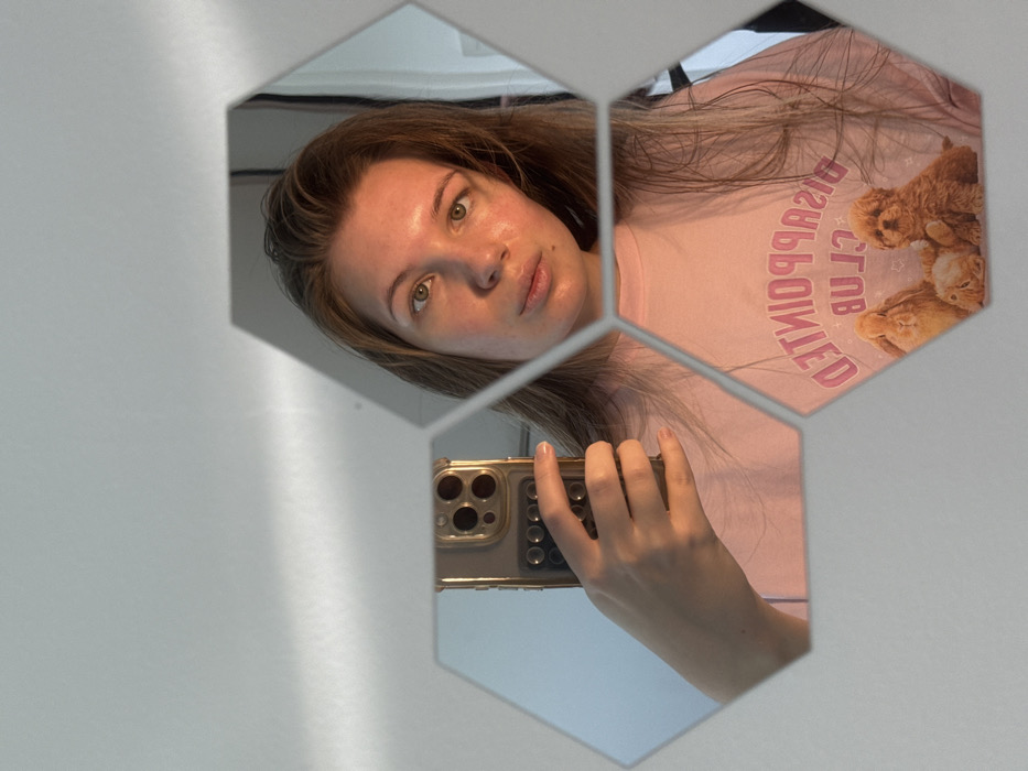 A young adult female is depicted in a mirror selfie, partially reflected across an arrangement of hexagonal mirrors mounted on a light-colored wall