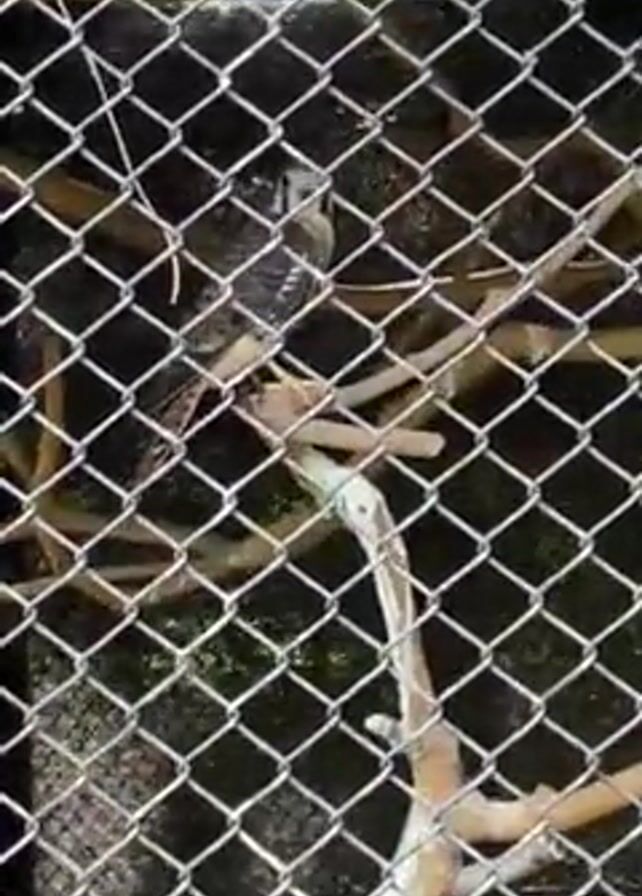 dark bird of prey, perhaps a hawk or falcon, perched on branches inside a wire mesh cage
