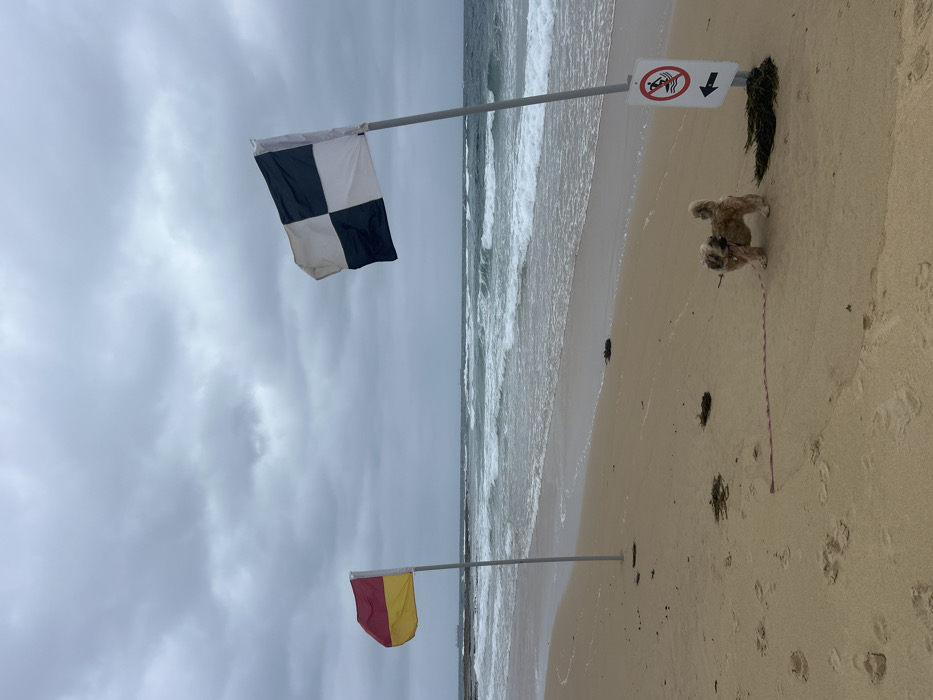 A beach scene under a cloudy sky features two lifeguard flags: a black and white checkered flag and a red and yellow flag. A sign with a "no fishing" symbol and a downward arrow is mounted on a pole. Two small dogs are standing on the sand near the water's edge, attached to a purple leash. The sand is covered with seaweed. Waves are visible in the background.