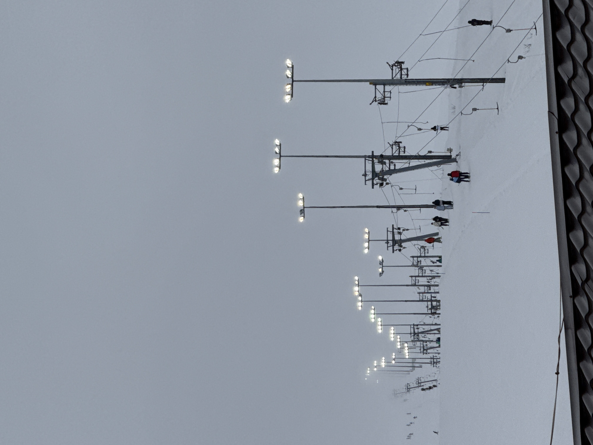 The image displays a snow-covered ski slope in Unknown, Russia, under an overcast or foggy sky. The scene is illuminated by at least 15 tall, slender poles, each topped with multiple bright floodlights. A series of surface ski lift towers, cables, and individual T-bar hangers are positioned along the slope, extending into the distance. Approximately 15 to 20 individuals, dressed in winter attire, are present on the snow. Some are standing near the ski lifts, while others are seen skiing or snowboarding. One individual is actively snowboarding towards the right-side lift, and two figures, one in a red jacket, stand conversing in the mid-ground. The bottom foreground shows a dark, tiled or corrugated roof structure. The environment suggests an active ski resort operating under artificial light during low-light conditions.