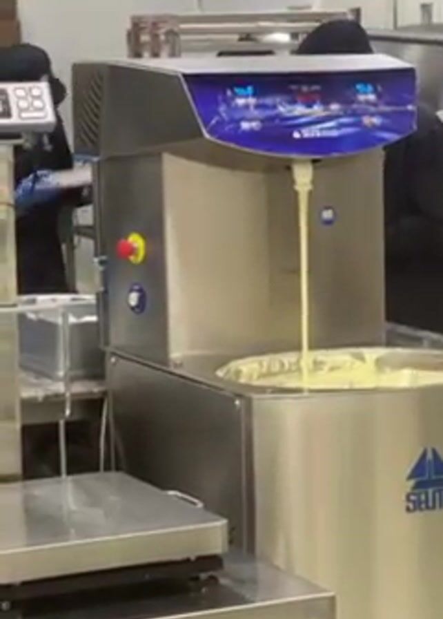 confectionary processing operation with a Selmi brand machine dispensing a light-colored liquid into a metal basin