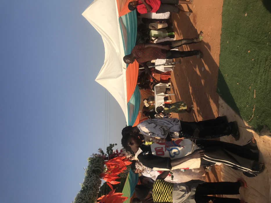 An outdoor event under a large white tent adorned with orange and turquoise draping. People stand and sit, some gathered around white tables. A floral arch with orange accents stands nearby. The sky is clear blue. The ground is a mix of dirt, grass, and artificial turf.