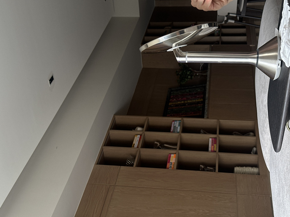 The image depicts the interior of a modern room in Mexico City, Mexico, viewed from a low angle. In the foreground, a brushed stainless steel, circular vanity mirror with a conical base stands on a small, irregular black object, which rests on a larger, light grey textured table. A crumpled white tissue is visible near the mirror's base. To the far right, a light-skinned human hand is partially visible. The background features a large, light-toned wooden wall unit with integrated closed cabinets on the left and a grid of open square shelves to the right. These shelves contain various items, including books with visible titles like "SICILY," "AMALFI," "TUSCANY," "ROME," and "CANNES," along with white ceramic vases and metallic decorative objects. To the right of the open shelving, a framed, rectangular artwork with vertical multi-colored stripes leans against the wall above a lower wooden cabinet. A vase with green foliage is partially visible to the right of the artwork. The ceiling is white with a light beige soffit and a single square recessed light fixture. Dark furniture is partially visible in the far-right background.