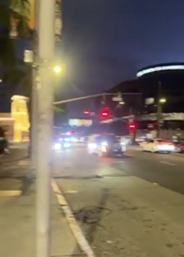 The video is shot at night, likely from a sidewalk. The first shot looks across a busy street at the Writers Guild of America West building. There are many cars on the road and the traffic signals are red. The camera then pans to the right, showing pedestrians walking on the sidewalk, palm trees, and streetlights. Some people are looking at their phones. The final shot is of traffic and a restaurant with a red neon sign. There is also a bus stop bench visible in the foreground.