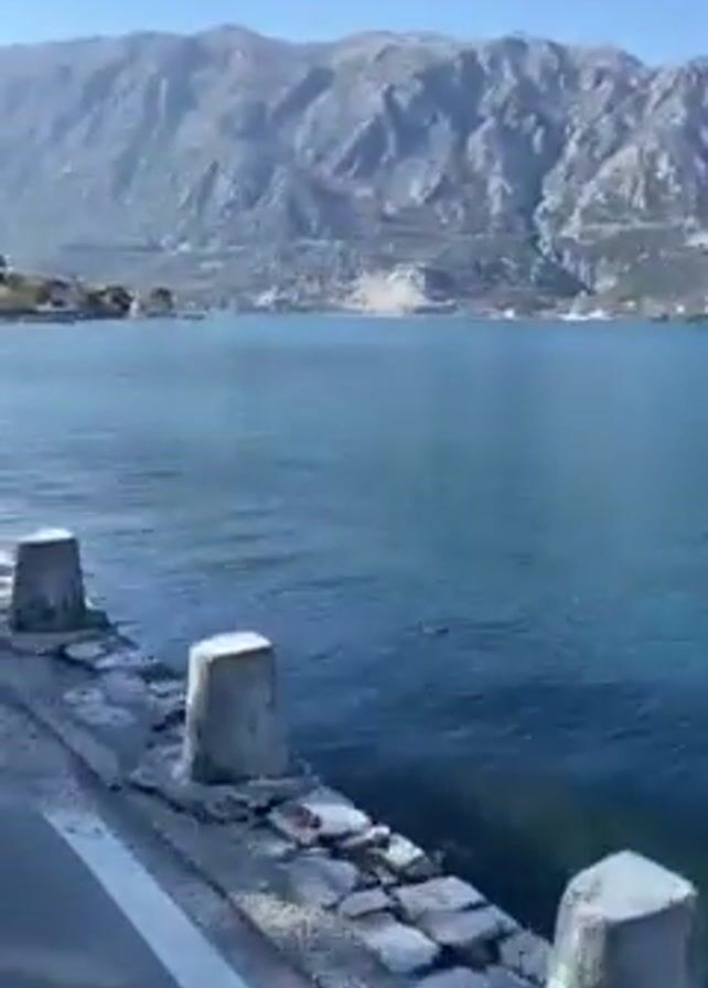 roadside view of a body of water with mountains in the background. The road has a white line marking and a guardrail. Along the water's edge, there's a stone barrier with concrete posts. The water is calm and blue. The mountains are rocky and gray, partially covered with some greenery. The sky is clear and blue. The camera is positioned on the side of the road, looking out towards the water and mountains.