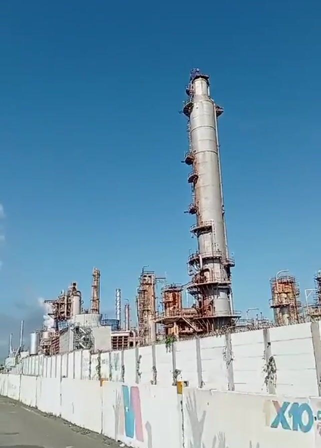 The video presents a wide shot of an industrial complex, likely an oil refinery, under a clear blue sky with scattered clouds. The foreground features a concrete wall, decorated with graffiti slogans and corporate logos, running along a paved road. In the background, a sprawling network of metallic structures, including tall distillation columns, pipes, and various processing units, dominates the landscape. Some units are releasing plumes of smoke, suggesting ongoing operations. The overall impression is of a large-scale industrial facility engaged in refining or processing raw materials. The camera appears to be in a moving vehicle, travelling alongside the facility.