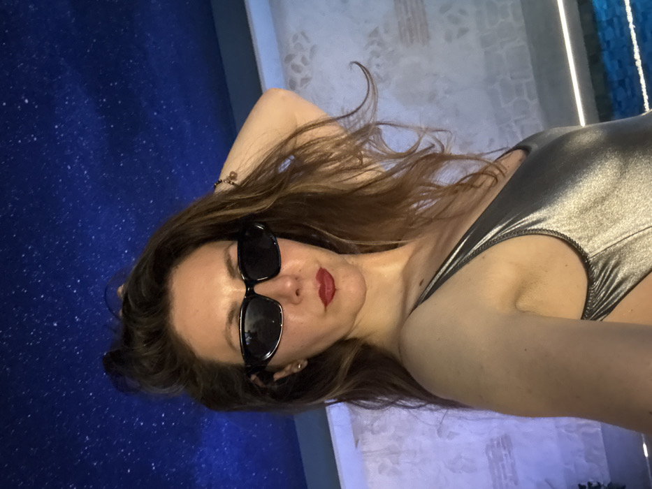 An adult female is depicted in a medium shot, facing the camera at a slight upward angle. She has long, wavy brown hair, some of which is styled upward. She is wearing black rectangular sunglasses and dark red lipstick. Her attire is a shiny, silver-grey one-piece swimsuit. Her left arm is raised, with her hand positioned near the back of her head, and a light-colored beaded bracelet is visible on her left wrist. The background consists of a dark blue ceiling with numerous white speckles, designed to simulate a starry night sky. To the subject's right, a light-colored, textured wall with faint patterns, possibly brick or decorative tile, is visible above a narrow strip of illuminated blue water, indicating a swimming pool or spa. The environment is an indoor setting with artificial lighting, casting a subtle blue-purple ambient glow on the left side of the scene. This environment is consistent with a luxury hotel or wellness center spa area in Sofia, Bulgaria, specifically resembling the indoor pool facility of Sense Hotel Sofia.