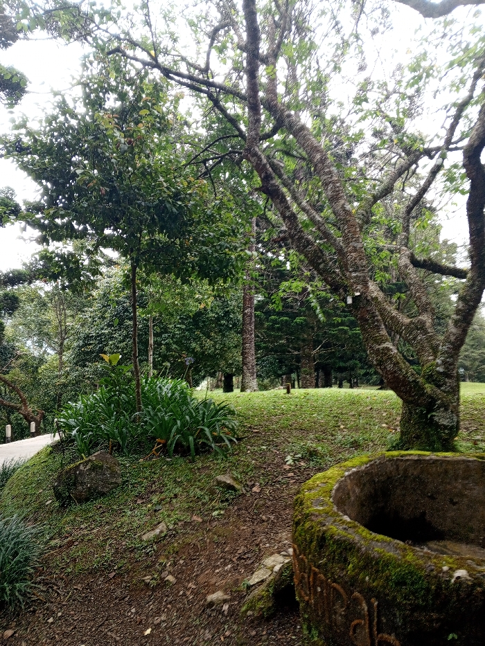 Lush greenery fills the scene. A gnarly, moss-covered tree dominates the right, its branches reaching skyward. To the left, a vibrant assortment of plants thrives near a winding road. A concrete structure, also draped in moss, sits in the foreground. Beyond, a grassy slope leads towards a dense forest, with tall, slender trees in the distance. The scene exudes tranquility and natural beauty.