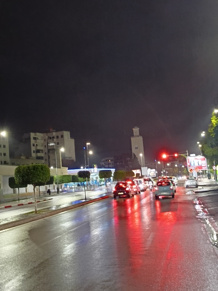 A wet street reflects red traffic lights and the headlights of several cars stopped at an intersection. Trees line the left side of the street. A tall, slim tower and multi-story buildings are visible in the background. A gas station with blue lights and white signage is on the left. The sky is dark, suggesting it is nighttime or an overcast day.