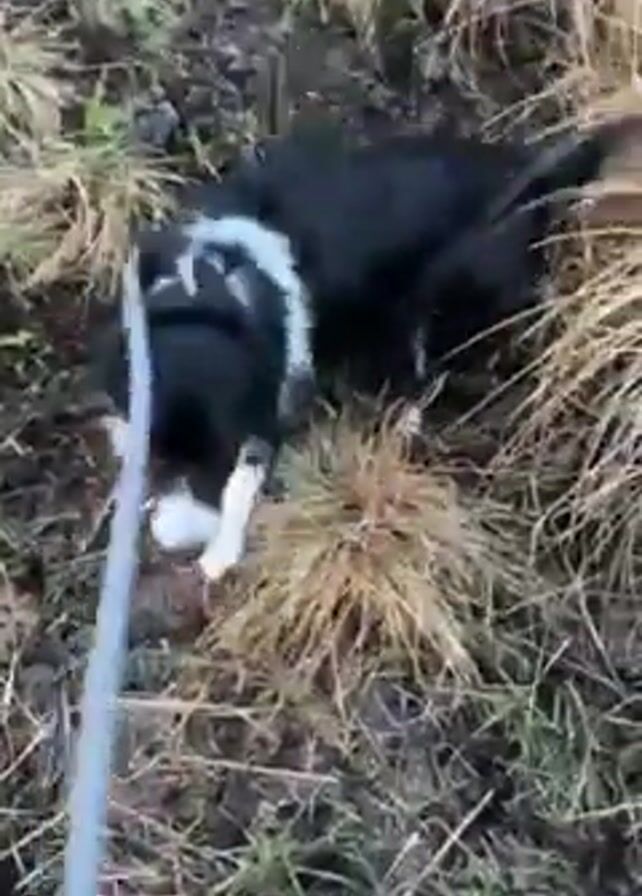 black and white dog on a leash in a grassy, muddy area