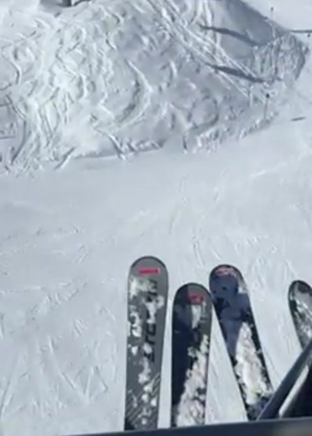 first-person view from a ski lift, looking down at skis and then up at a snow-covered ski slope with other skiers and ski lifts. The person filming is wearing patterned black and white pants. The skis are also white with grey and black patterns and the words "DC" are visible on the top. The snow is white and marked with tracks. The sky is blue and clear. The ski lift is moving up the slope.