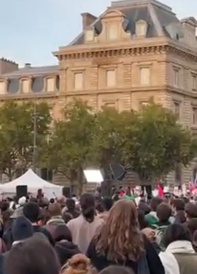 large crowd of people gathered in a city square. Many people are holding Palestinian flags and signs. The crowd is in front of a building that has a light-colored facade and a dark roof. Trees are in the foreground as well. A voice in the background repeats the phrase "Stop aux genocides" which means "Stop the genocides." The camera is moving slightly, capturing different parts of the crowd. The sky is overcast.