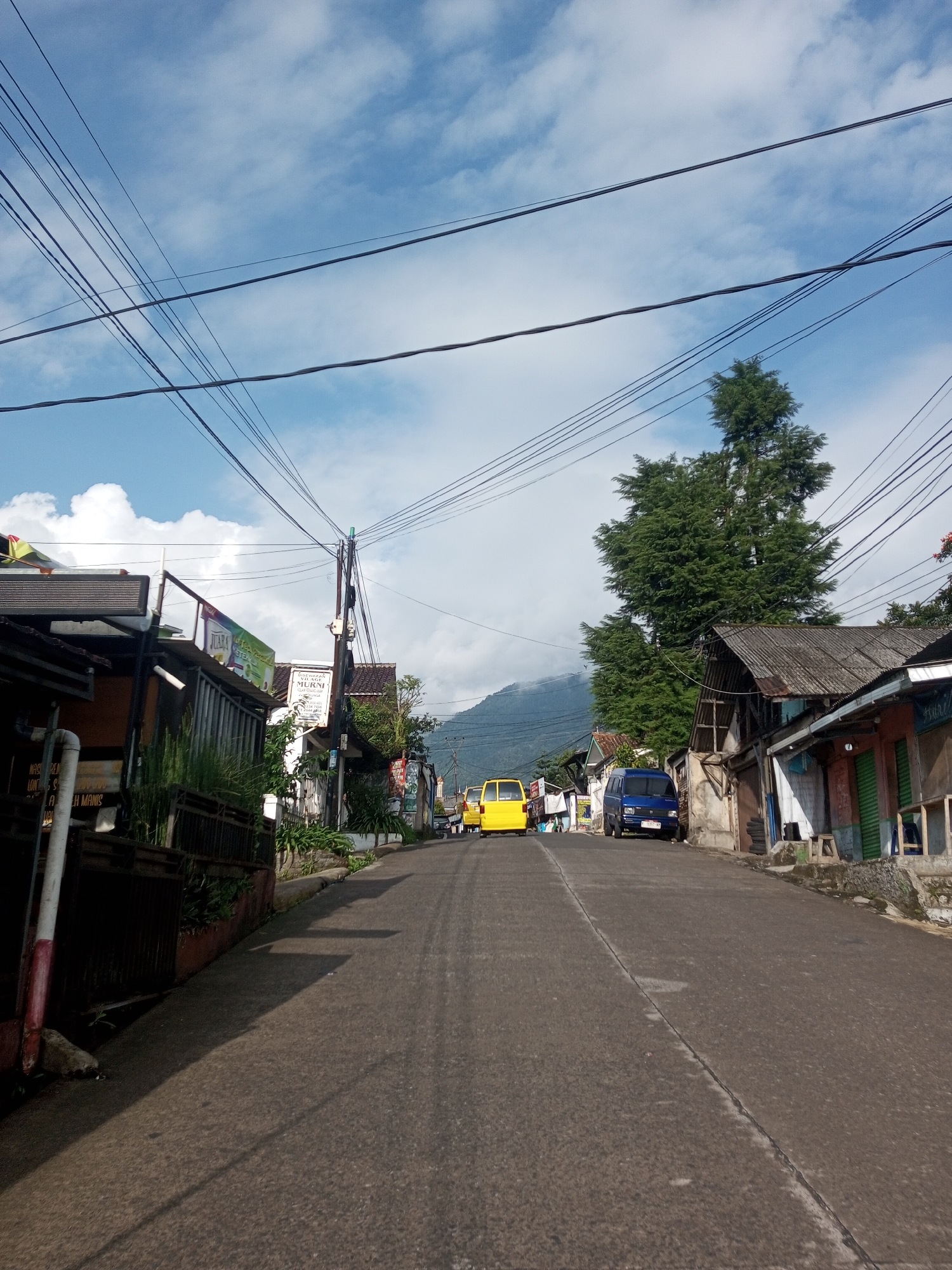 street scene in what appears to be a residential or commercial area, possibly in or near Mya Sit Kaing Ywar Thit, Myanmar. The road is asphalt and slopes upwards into the distance. Buildings are present on either side of the road. The buildings appear to be a mix of residences and small businesses, with a variety of architectural styles and materials. Two vehicles are visible: a yellow van further up the road and a dark blue van parked on the right side of the road. Power lines are strung overhead. The sky is blue with scattered white clouds. There are trees and greenery interspersed among the buildings. A mountain is visible in the background, partially obscured by clouds or mist. No people are clearly visible. The light suggests it is daytime, with shadows cast along the road. The scene appears quiet and ordinary.