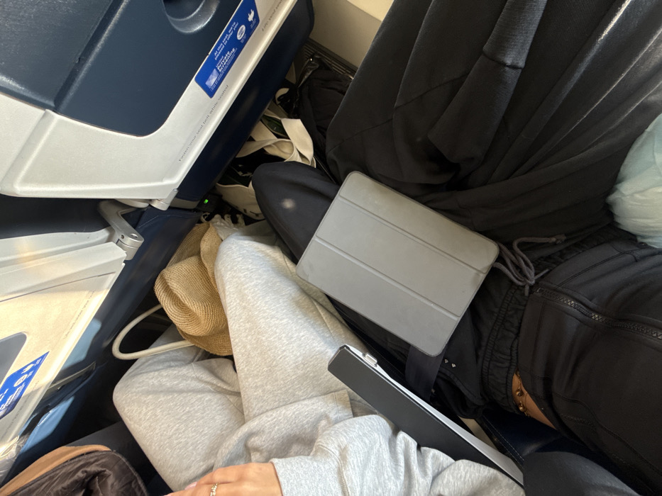 The scene depicts the interior of an airline cabin, consistent with an aircraft at or en route to/from Charles de Gaulle Airport (CDG) in Roissy-en-France, France. Two individuals are partially visible, seated in adjacent passenger seats. The person on the left wears light gray sweatpants and a matching long-sleeved top; a light brown straw hat rests on their lap. Their right hand, adorned with a ring, is visible. A black smartphone with a metallic edge is positioned near their left leg on an armrest. The person on the right, clad in black track pants featuring a drawstring and a zippered pocket, has a gray tablet device with a folding cover resting on their lap. A gold-colored beaded ankle bracelet is visible on their right ankle. The immediate environment includes blue and white seatbacks, part of a tray table mechanism, and various personal belongings such as a tan bag in the upper left and dark fabric items on the floor. A small green indicator light is visible near the floor. A partial airline safety instruction label on the seatback reads, "Fasten your seat belt while seated."