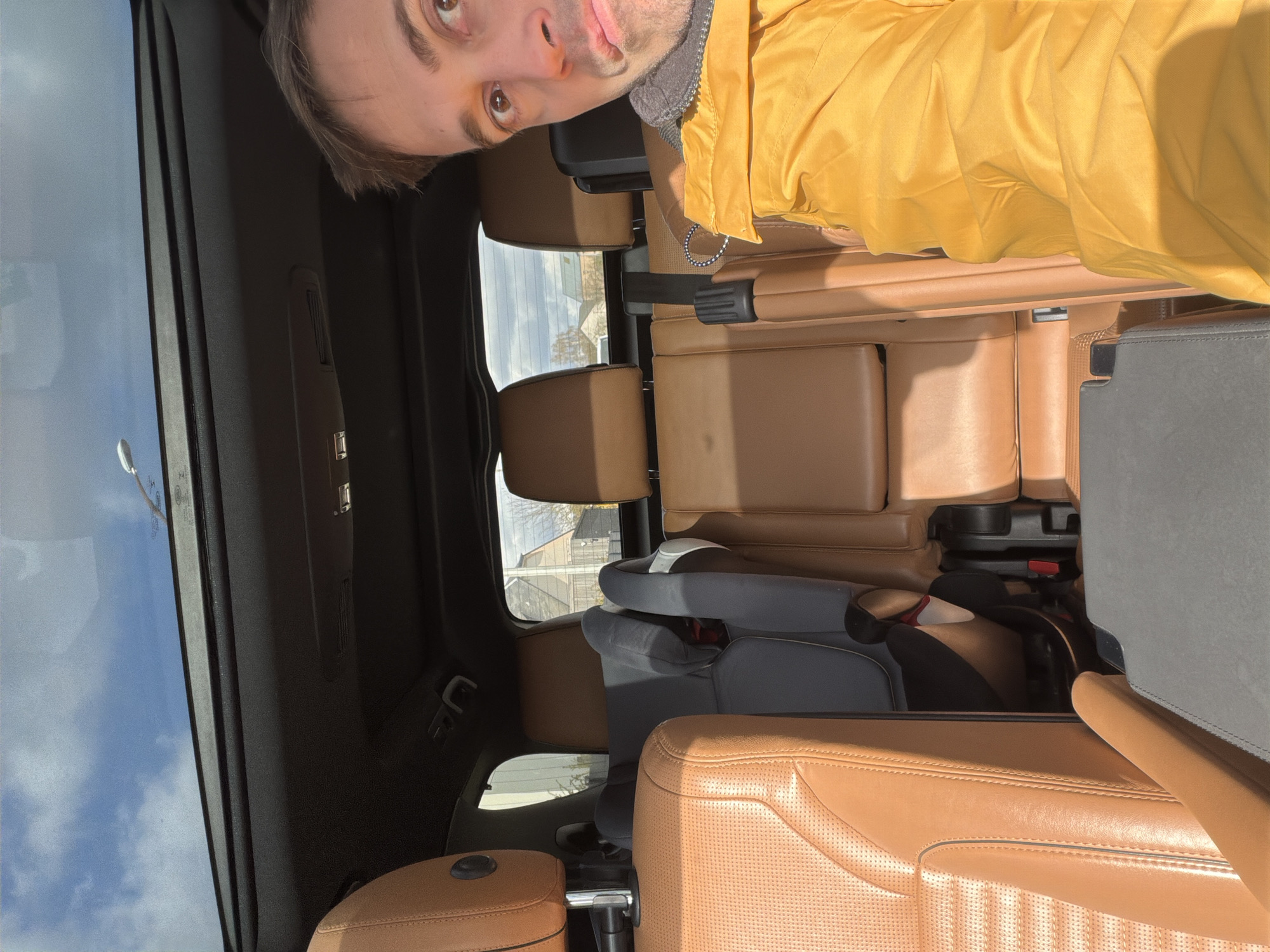 A selfie taken inside a vehicle reveals an adult male and the vehicle's interior. The male subject, positioned on the right of the frame, has light brown hair and brown eyes, wearing a yellow jacket over a grey garment, with a neutral expression. The vehicle's interior features tan/brown perforated leather seats across multiple rows. A grey child safety seat is installed in the center of the second row. A panoramic sunroof is visible overhead, showing a clear blue sky with scattered white clouds, indicating daylight. Through the rear window, residential buildings with pitched roofs and bare trees are visible, along with a distant white vehicle. The vehicle is located in Reckange-sur-Mess, Luxembourg.