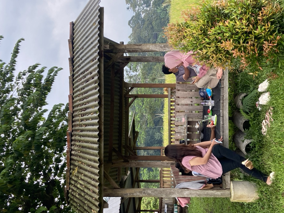- "The image depicts an outdoor, open-air dining or resting area in Penanggungan, Indonesia, characterized by a rustic wooden gazebo structure with a corrugated metal roof, partially covered in leaves and moss, and some loose terracotta roof tiles" by FM-htxI33, licensed under CC BY 4.0