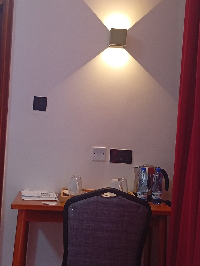 This image depicts a segment of an indoor room, identified as being in Murang'a, Kenya. The scene is dominated by a white wall, on which a cube-shaped wall sconce is centrally mounted, emitting light upwards and downwards. Below the light fixture, a black square-shaped object is affixed to the wall, followed by two white electrical outlets and a dark rectangular control panel. A light brown wooden table with angled legs is positioned against the wall. On the table's left side, a stack of white papers or a brochure is visible. To the right, an arrangement for beverages includes a black electric kettle, two plastic bottles of "Dulton" branded water, and two clear inverted glasses resting on a light wooden tray. The upper backrest of a dark grey fabric chair, featuring a black frame and metallic studs, is prominent in the immediate foreground, partially obscuring the table. A vertical section of a red curtain is visible along the far right edge of the frame. No individuals are present in the scene.