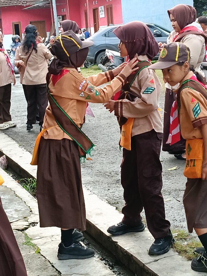 Several young people dressed in scout uniforms stand on a concrete surface near a gutter. The uniforms consist of tan tops and brown bottoms, with hats and scarves. One scout is adjusting the scarf of another. Additional scouts stand nearby, with buildings and vehicles visible in the background. The weather appears to be overcast.