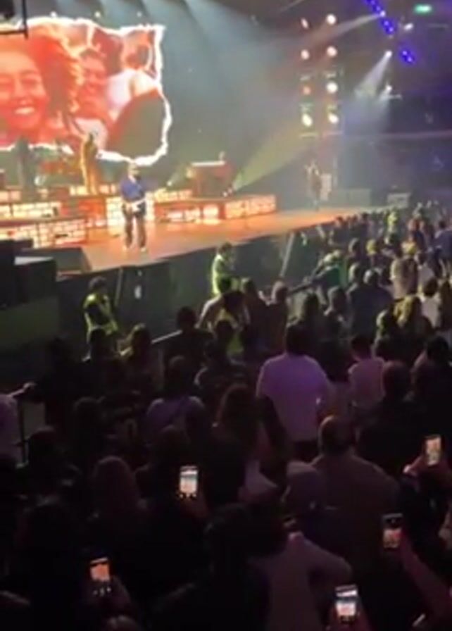 A live concert is taking place in a large indoor arena. A band is performing on a stage adorned with what appears to be brick-patterned decorations. A large screen behind the band shows a collage of images. The lead singer, a Black man in a blue suit, stands center stage performing. Below the stage, a crowd of people are watching the performance, many holding up their phones to record. Security personnel in yellow vests stand between the crowd and the stage. The arena is dimly lit with stage lights illuminating the performers and parts of the crowd.