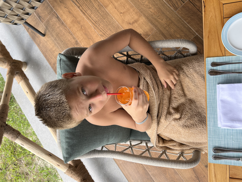 An overhead-angle photograph depicts a young male individual, estimated to be between 8 and 12 years old, seated outdoors on a resort balcony or terrace in Zanzibar, Tanzania. The boy has short, light-brown, wet-looking hair and is shirtless, wrapped from the waist down in a light brown towel. He wears a light blue bracelet on his left wrist. He holds a clear glass containing an orange beverage with ice and a red straw, which is in his mouth, indicating he is drinking. His gaze is directed forward, towards the camera. He is seated in a light-colored wicker chair with a dark green back cushion. In the foreground, a wooden table is set with a light blue textured placemat, a white folded cloth napkin, a light blue and white rimmed plate, and silverware consisting of two forks and two spoons. The floor is composed of light-colored wooden planks. To the left, a rustic railing constructed from natural wood poles bound with rope is visible, beyond which green foliage is present.