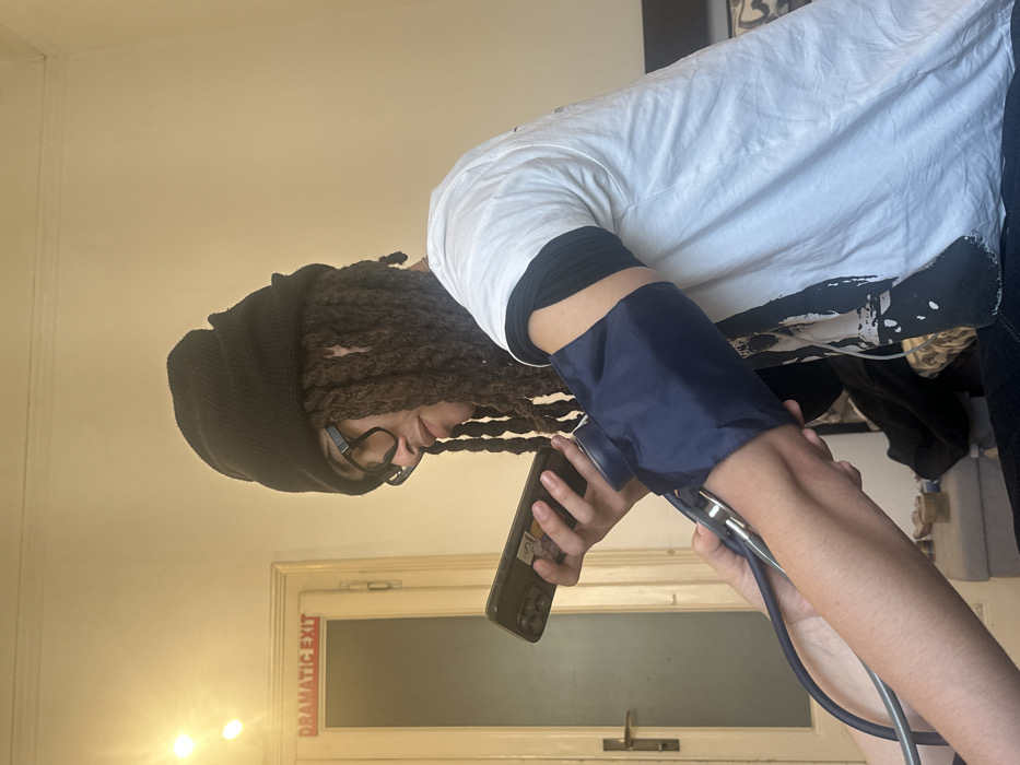 A male individual with dreadlocks, wearing a black beanie and dark-rimmed glasses, is depicted in an indoor setting in Milan, Italy. He wears a white short-sleeved t-shirt over a dark long-sleeved shirt. His attention is directed downwards towards a dark-colored smartphone he holds in his right hand. A dark blue blood pressure cuff is wrapped around his left upper arm, with an unseen individual's forearm and hand operating the connected pump and tube, positioned in the lower-left foreground. The background features a light-colored wooden door with a brass-colored handle. Above this door, the words "DRAMATIC EXIT" are visible in red lettering on a clear panel. A light fixture with an exposed bulb is mounted on the wall to the left of the door. The walls are painted a light, neutral color. A glimpse of a dark headboard or furniture piece is visible in the background on the right.