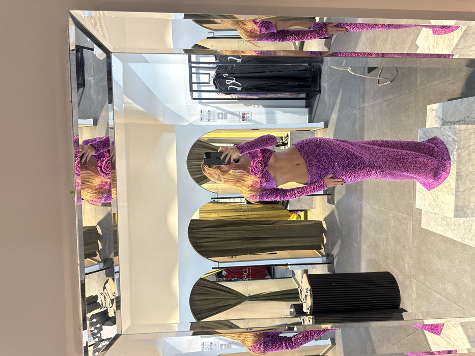 This image captures a mirror selfie taken by a female individual within a contemporary clothing boutique in Mexico City, Mexico