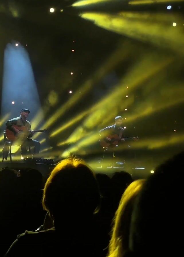 concert from the point of view of a person in the audience. Three men are on stage, seated and playing acoustic guitars. The stage is illuminated with yellow lights, creating a smoky atmosphere. The musicians are silhouetted against the lights. The audience members are also silhouetted in the foreground.