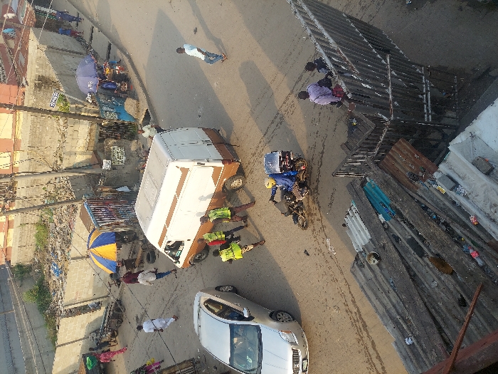 An aerial view reveals a bustling street scene with cars, motorcycles, and pedestrians. A white and brown van is parked along the roadside, surrounded by people in brightly colored vests. Nearby, a motorcycle rider in blue stands by their bike. Buildings and temporary structures line the street, with a variety of objects scattered about. The street is filled with activity under the sunlight.