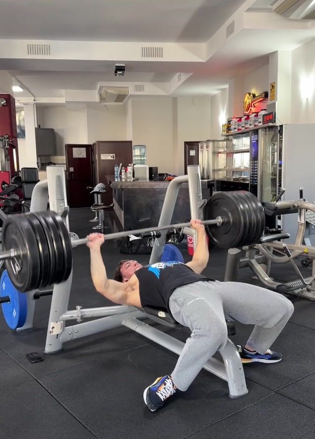 muscular man in a gym performing a bench press