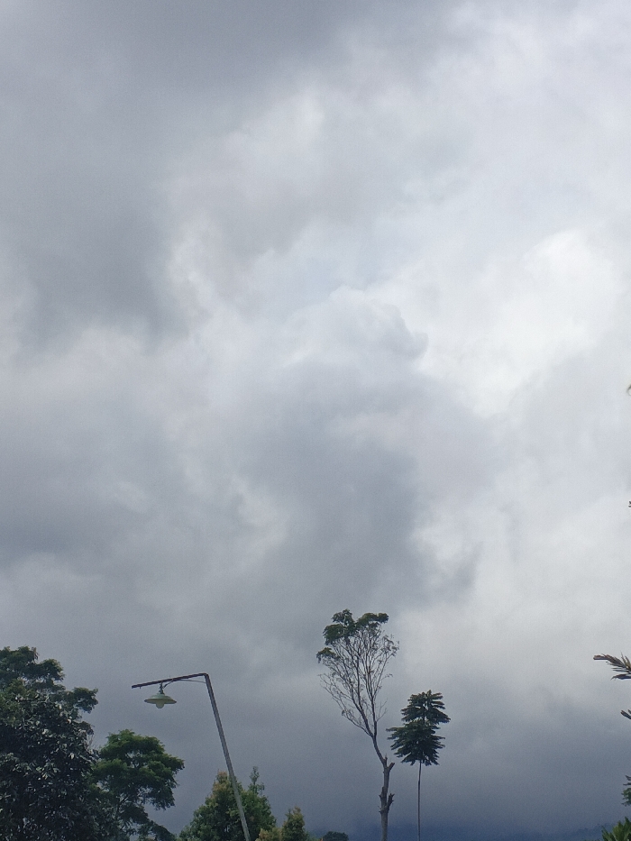 The scene is set in the city of Quảng Ngãi, Vietnam, under a heavily overcast sky. The upper two-thirds of the image are filled with dense, varied shades of grey clouds. The lower section features a dark, slender street lamp post with a light green, bell-shaped fixture, positioned to the left of the frame's vertical center. To the right of the lamp, a tall, thin tree with sparse green foliage at its apex stands next to a shorter, denser evergreen tree. Further dark green foliage from other trees is visible along the bottom edge and extending from the left side of the frame. The horizon line presents a dark, indistinct band. No individuals or specific actions are present.
