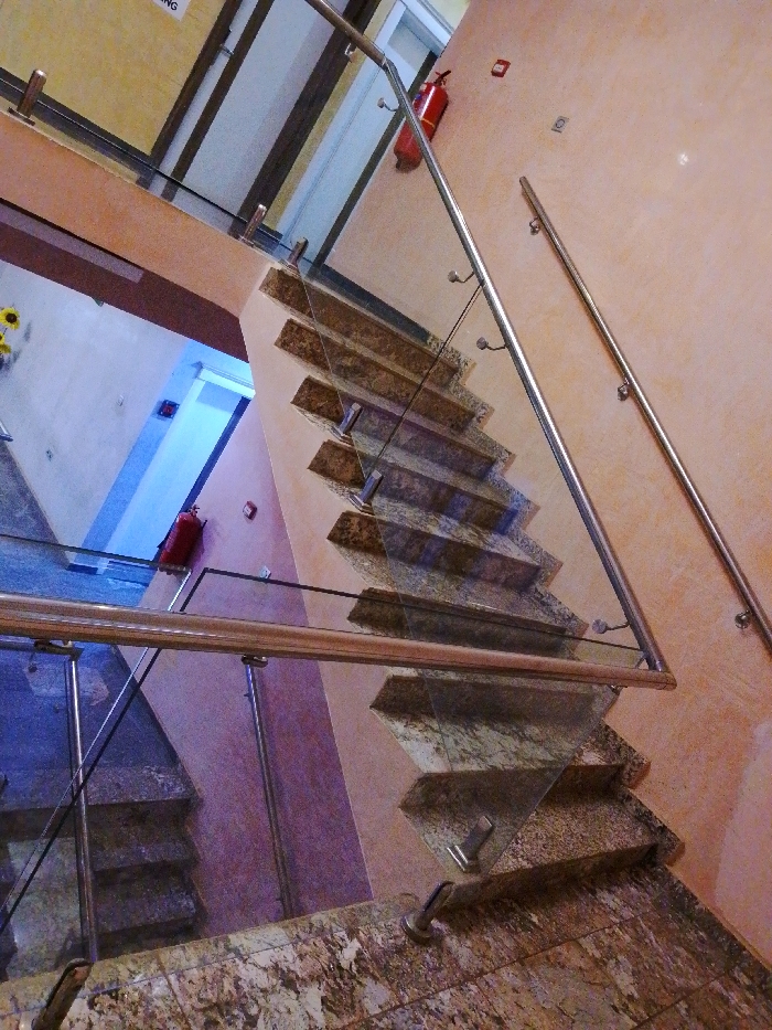 An upward view of a stairway shows marble steps with glass railings, ascending along a light orange wall. A secondary metal handrail is also affixed to the wall. At the top of the stairs is a red fire extinguisher. In the adjacent hallway, a smaller fire extinguisher is visible. The flooring is a speckled marble pattern.