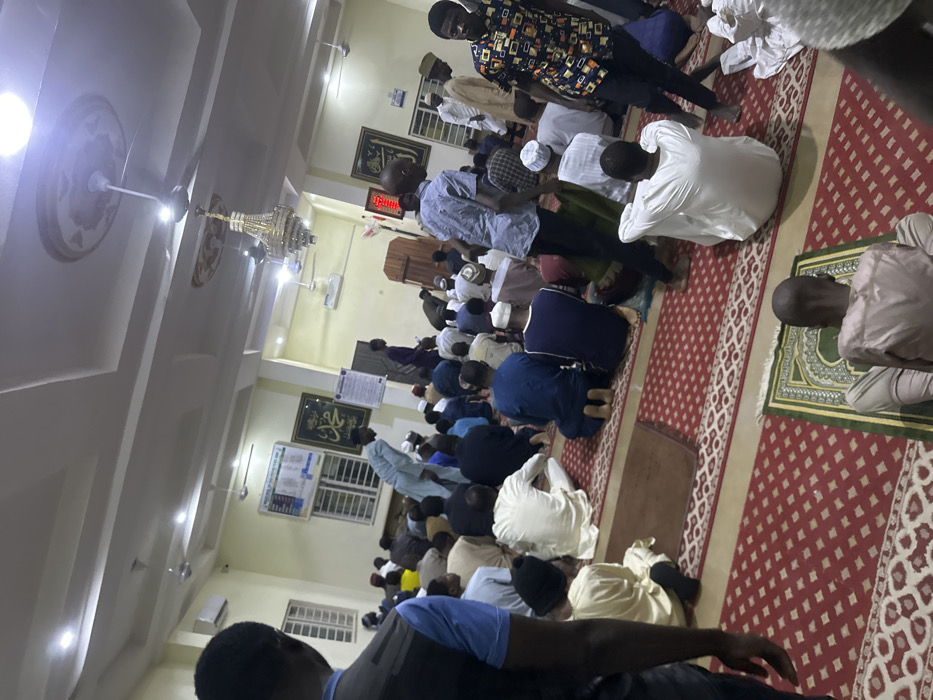 The image depicts the interior of a mosque in Gandu Albasa, Nigeria, populated by approximately thirty to forty adult males