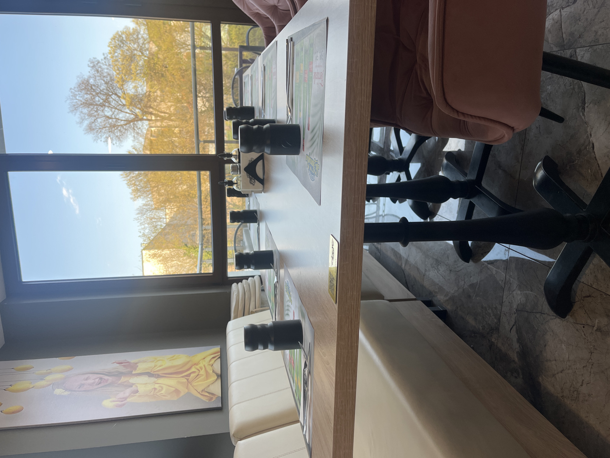 interior of a restaurant, likely in Yambol, Bulgaria, given the presence of a restaurant name. A light-colored wooden table is centrally positioned, set with placemats and salt and pepper shakers. One side of the table is lined with a white bench seat, while the other side has a pink chair. A large window overlooks a tree-filled outdoor scene with a blue sky. On the wall hangs a piece of modern art depicting a person in yellow tones. The floor appears to be marble or a similar stone. The lighting suggests it is daytime. The overall setting indicates a modern and clean aesthetic.