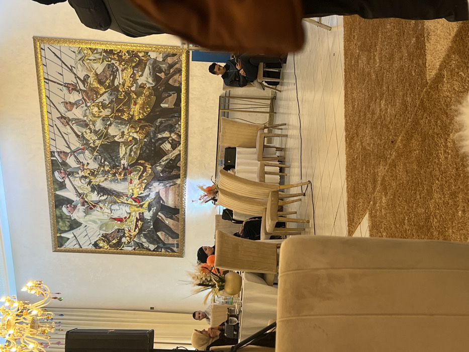 A banquet hall with a large framed painting depicting a battle scene. Several rows of empty, beige chairs face a head table covered with a white cloth, decorated with floral arrangements. People are seated at the head table. A chandelier hangs from the ceiling. A man sits in a chair near the painting. A brown rug covers part of the floor. People are partially visible in the foreground.