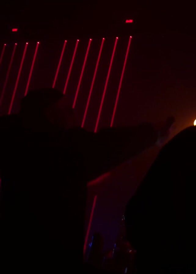 silhouette of a person singing into a microphone on stage in front of a crowd. The stage has red lighting arranged in diagonal lines. A warm amber spotlight shines from behind the person. The person uses hand gestures while singing. The video is dark and somewhat grainy.
